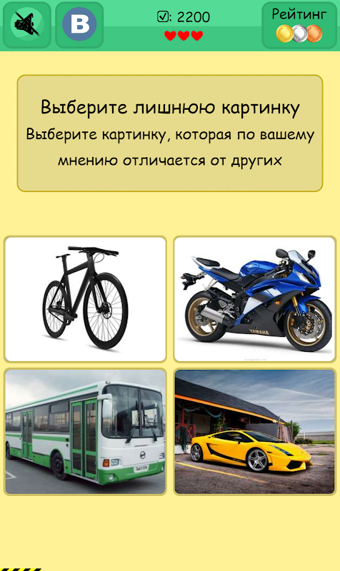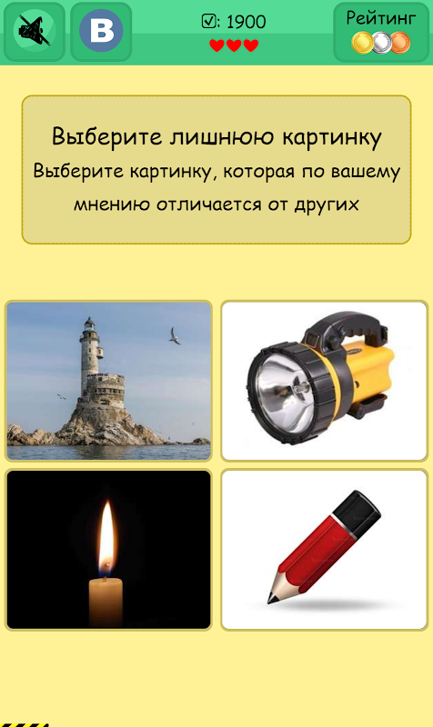 Необходимо выбрать картинку, которая выбивается из 3-х других по какому-то критерию.