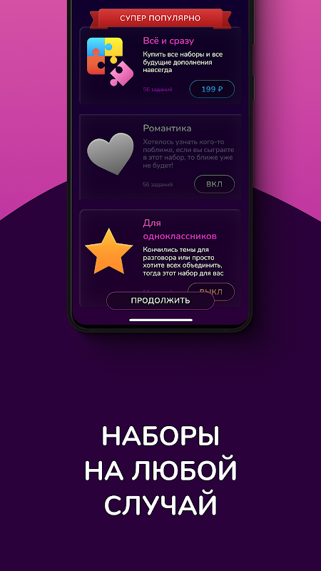 Правила не придется долго объяснять — никаких занудных подробностей и муторного подсчета очков. Только безудержное веселье, потоки взаимных обвинений, ушат сомнительных аргументов и безумное фантазирование о совместном будущем. Игру легко начать в любой обстановке: хоть в баре, хоть в автобусе . В приложении 10 разных колод по 60 вопросов, заточенных на все случаи жизни: для тех, кто только познакомился и для тех, кто знает друг друга всю жизнь. Для самого отвязного девичника и для того, чтобы скоротать школьную поездку. Для более приличной компании, и для самых мерзопакостых негодяев, которые только и думают, как уличить друг друга в какой-нибудь гадости. Вопросы продуманы так, чтобы любая компания могла найти что-то подходящее, а каждый участник оказался в центре внимания.