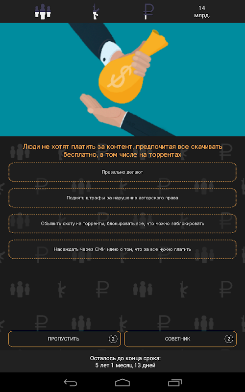 En el juego, puedes ponerte a prueba en el papel del presidente, que recorta el presupuesto estatal. Entendemos que en el mundo real esto es impensable, pero este es un juego.