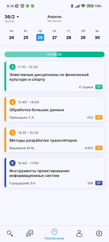 En la tarjeta de la lección puede encontrar: el número y el tiempo de la pareja, el nombre de la disciplina, el nombre del maestro, el número de la audiencia, el tipo de lección y el tiempo antes del inicio / final de la lección.