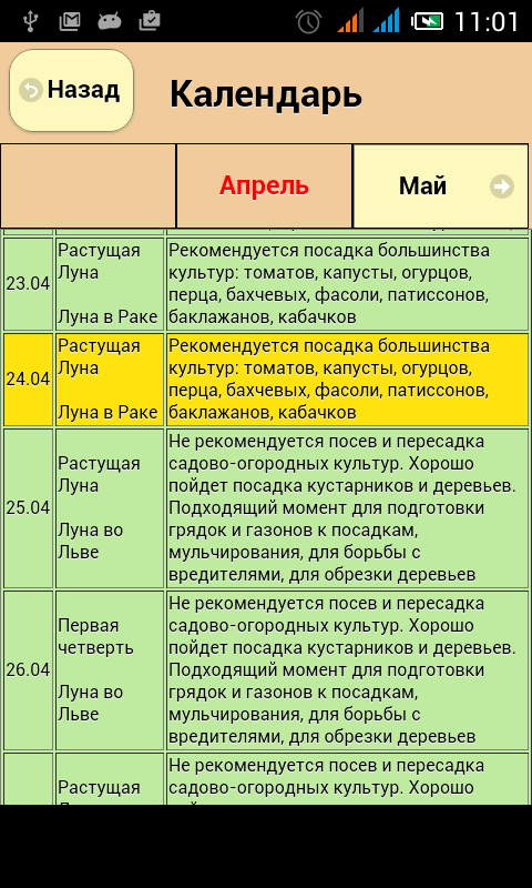 - un directorio de cultivos de jardín, que incluye los días más favorables, tecnología agrícola y consejos útiles;
