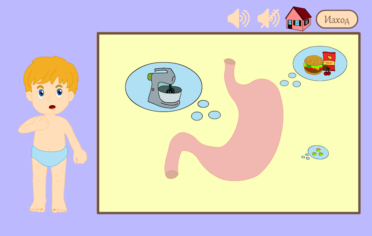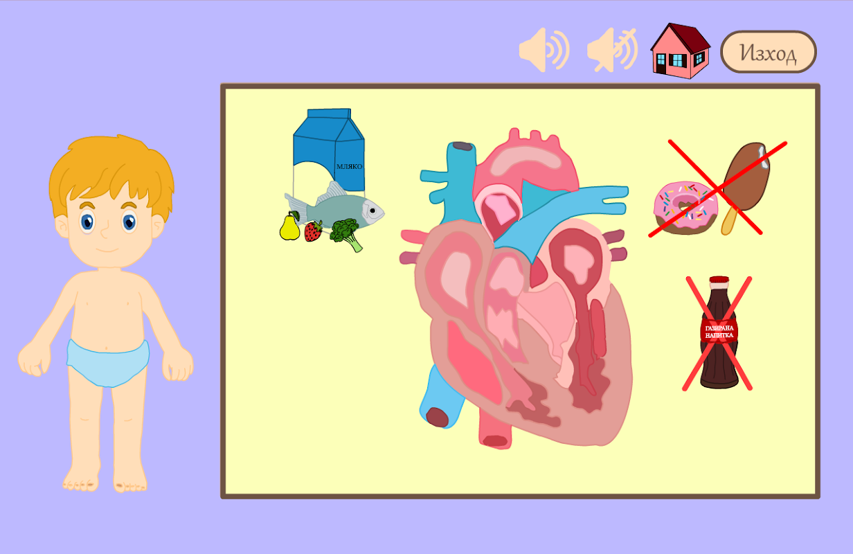 Приложението е подходящо за деца от 8 до 11 години. В него са разработени 5 урока, които включват 5-те основни органа в човешкото тяло: сърце, мозък, бели дробове, стомах и черва(тънко и дебело). Всеки от уроците е анимиран, за да може да разберете най-важните факти за всеки от органите максимално добре. Проектът включва и 3 игри, с които може да упражните запомненото до момента. В първата игра може да упражнявате паметта си, като се използват двойки карти със съответния орган и името му. Във втората игра трябва да се поставят органите на местата им в човешкото тяло. В третата игра ще се появяват храни, които трябва да се разпределят на две места: кошче за боклук, ако са вредни или кошница, ако са полезни. За фон звучи музика, която може да бъде спряна по всяко време. Също, над основното платно, върху което се появяват уроците и игрите, са поставени бутони, всеки от които води до различна функция: меню, изход, спиране и пускане на звука.