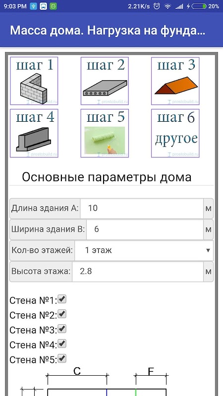 1. Нагрузка от стен. Вам предстоит задать габариты вашего дома, количество этажей и высоту этажа. Также из большого количества схем дома, можно выбрать вашу, задать материал и толщину стены. При этом будет произведен расчет массы всех стен, и вы можете переходить ко 2-ому этапу.