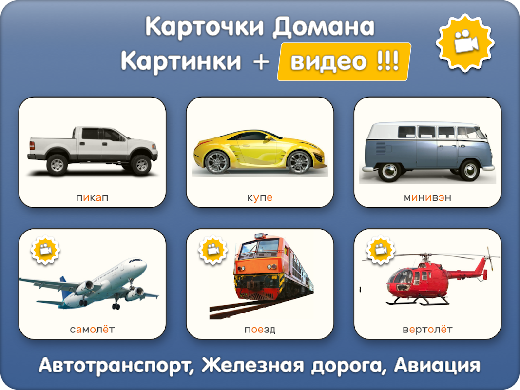 Las imágenes de muchas tarjetas se complementan con videos cortos. Por ejemplo, cómo se apresura un camión de bomberos, un avión despega, un tractor trabaja en un campo o una grúa en un sitio de construcción. Estos videos son muy emocionantes para los niños y les ayudan a aprender el significado de nuevas palabras aún más rápido.