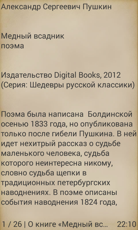 La editorial Digital Books se dedica a popularizar las obras de la literatura clásica y apoyar a los autores principiantes. Publicamos libros en forma de aplicaciones para dispositivos móviles basados en el sistema operativo Android. Mediante un menú sencillo, cada lector puede personalizar la visualización del libro para adaptarlo a las características de su dispositivo.