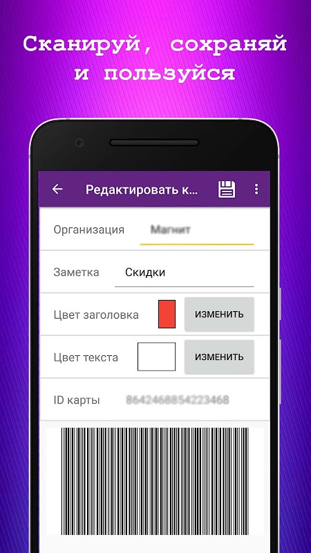my Card: ayudará a liberar espacio en su billetera. Ahora no es necesario llevar todas las tarjetas de descuento, bonificación o descuento con usted, simplemente escanee y guarde en la aplicación, y luego use la copia guardada en la aplicación. Habrá más espacio en su billetera, bolsillo o bolso, y nunca olvidará la tarjeta deseada en casa, simplemente escanee el código de barras de la tarjeta y siempre estará con usted.