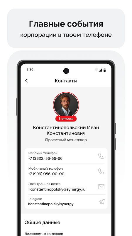 ¡Mantenga a mano el directorio telefónico de sus empleados! Busque colegas por nombre, vea toda la información sobre las actividades, habilidades y logros profesionales del empleado.