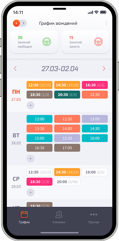 La aplicación móvil "Master of Industrial Driving Training" está diseñada para que los maestros de las autoescuelas simplifiquen y sistematicen el proceso de inscripción de los estudiantes a las lecciones de conducción. La aplicación incluye varias características clave: