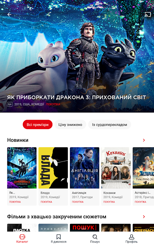 • Блокбастеры и премьеры с возможностью выбора звуковых дорожек, субтитров и качества видео.