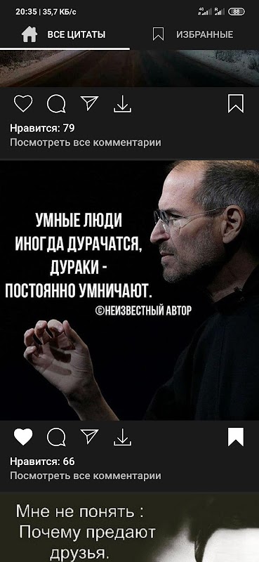 Las aplicaciones seleccionaron un elegante tono oscuro. Es muy conveniente compartir pensamientos de la colección con sus amigos en mensajería instantánea o en las redes sociales. La colección de citas se actualiza constantemente, y la aplicación en sí misma se mejora regularmente desde un punto de vista tecnológico.