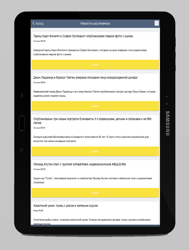 В приложении 'Новости шоу бизнеса' новости отсортированы по следующим рубрикам: