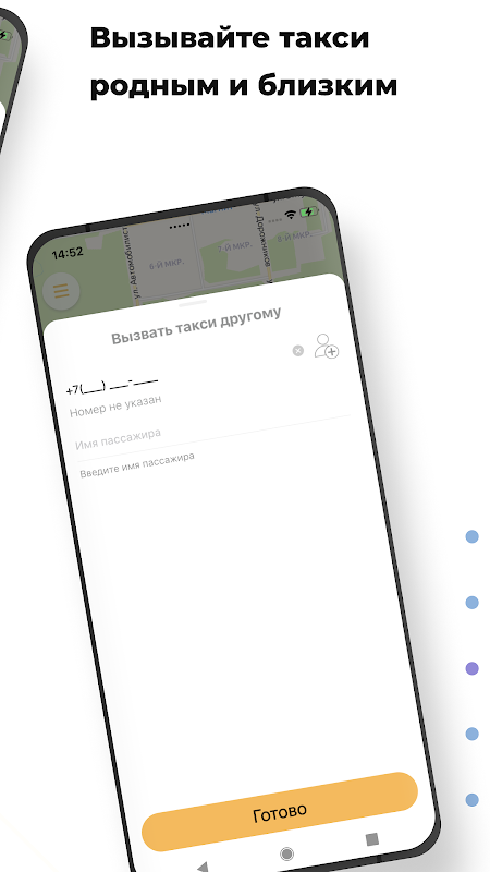 Utilice la opción "Llamar un coche a otra persona" en la sección "Deseos" e indique su número de teléfono. Cuando llegue el coche, se enviará un SMS al número especificado y recibirás un mensaje en la aplicación.