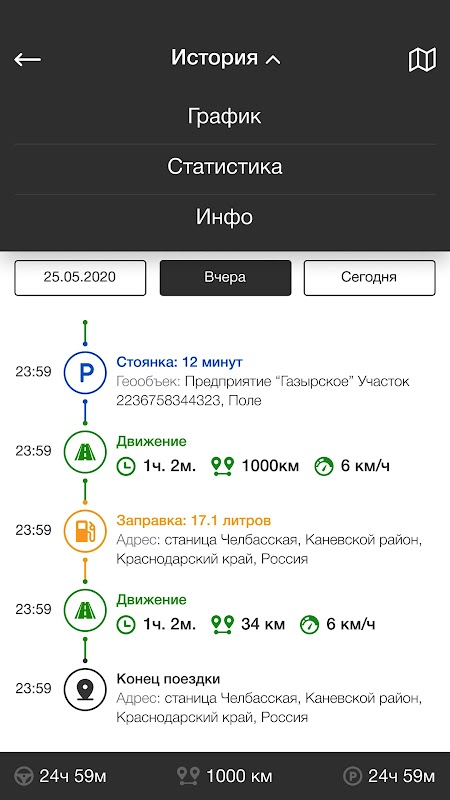 Una aplicación móvil para el monitoreo satelital de transporte GLONASS, se utiliza para el control operativo sobre el movimiento de equipos, límites de velocidad, recorridos diarios, estacionamiento, nivel de combustible, consumo de combustible, velocidad del motor, voltaje de la red a bordo, accesorios, temperatura y muchos más. otros parámetros conectados. La aplicación es conveniente para su uso en el trabajo diario para una planificación y control precisos de la operación de vehículos y equipos especiales, control de mantenimiento, finalización oportuna de las tareas de producción, así como prevención de viajes ilegales y robo de combustible.