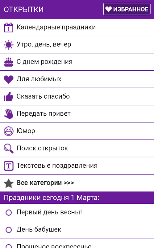 Календарные праздники. В приложении вы найдете открытки на все популярные календарные праздники, Новый год, Рождество, 14 февраля - День святого Валентина, 23 февраля - День защитника Отечества, Масленица, 8 марта - Международный женский день, 1 апреля - День смеха, Пасха, 1 мая - Праздник весны и труда, 9 Мая - День Победы, 1 сентября - День знаний.