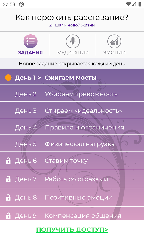 Ты не будешь одна, в минуты, когда будет особенно трудно, слушай мои аудио-медитации. После прохождения заданий они станут доступны в специальном разделе.