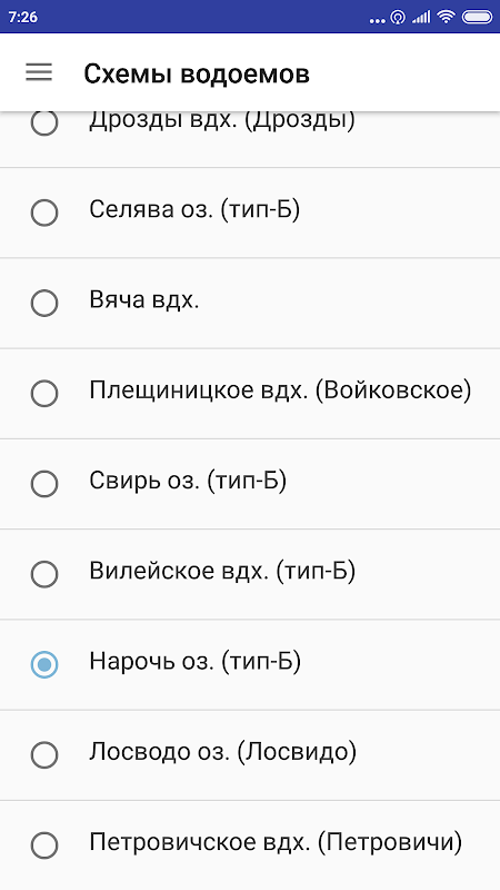 Patrones de profundidad disponibles: vdh. Zaslavskoe (Mar de Minsk), vdkh. Dubrovskoe (Raubichi, Prilepy), Petrovichskoe en el aire., Drozdy en el aire., Lago Losvido., Lago Selyava. (tipo B), Volchkovichskoe en el aire. (Pájaro), Lago Yanovo, Pleshchinitsky en el aire. (Voikovskoe), lago Svir. (tipo B), Vileika en el aire. (tipo B), lago Naroch. (tipo-B), CHPP-5 v. m., Sergeevich (esquema de canales), Soro oz. (tipo B), lago Boginskoe. (punta B), estanque Navoi, Strusto y Snudy oz. (tipo B), Miastro y Batorino oz. (tipo B), selecciona vdh., Krynitsa vdh., Rudea vdh. y otros