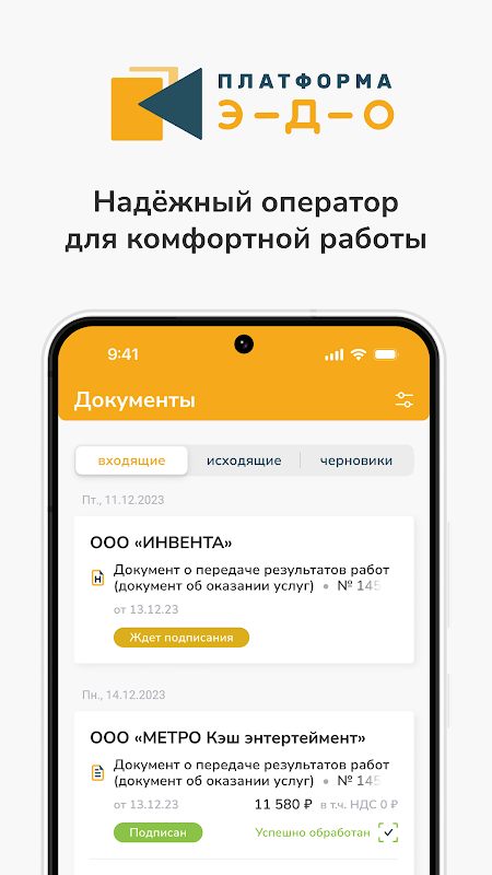 La aplicación Plataforma EDF servirá como una continuación cómoda y fiable del servicio web del mismo nombre para la gestión de documentos electrónicos de importancia jurídica. Con la aplicación, puede ver listas de documentos, incluido el uso de filtros, ver los documentos en sí y realizar un seguimiento rápido de los estados de EDF. Acelere la interacción con las contrapartes enviando invitaciones a roaming (intercambio de documentos entre suscriptores de diferentes operadores) directamente desde la aplicación. La aplicación y el servicio web de la Plataforma EDF cuentan con un servicio de soporte unificado, por lo que puede crear rápidamente nuevas solicitudes en la aplicación si es necesario.