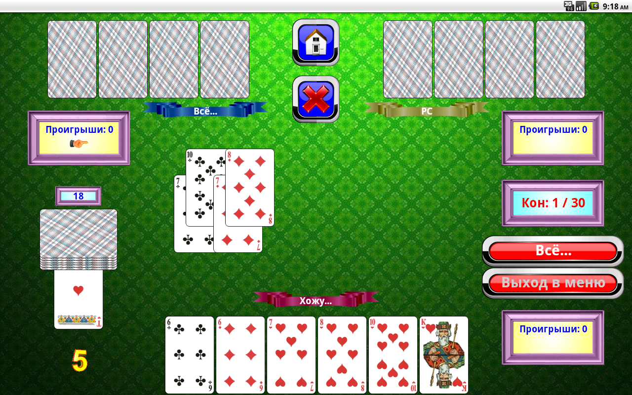 Интеллектуальная карточная игра подкидной "Дурак" для троих игроков. Сыграв 30 конов при хорошем счёте игрок попадает как в локальную таблицу чемпионов, так и в мировую. Можно выбрать одну из трех любимых советских колод: Атласную, Майя или Славянскую. Требуется размер экрана 800x480 или лучший. Поддерживаемые языки: English + Русский.