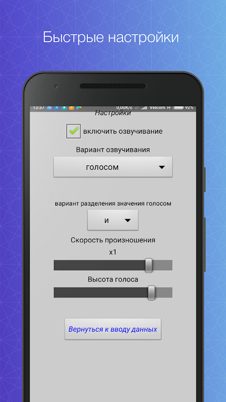 Введенные значения дублируются голосом или звуком по желанию и определяются в настройках.
