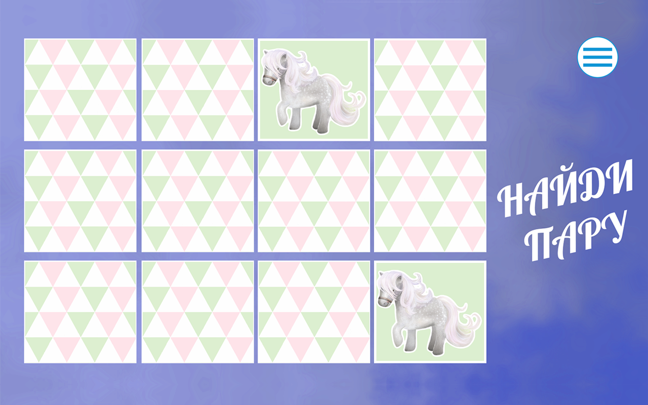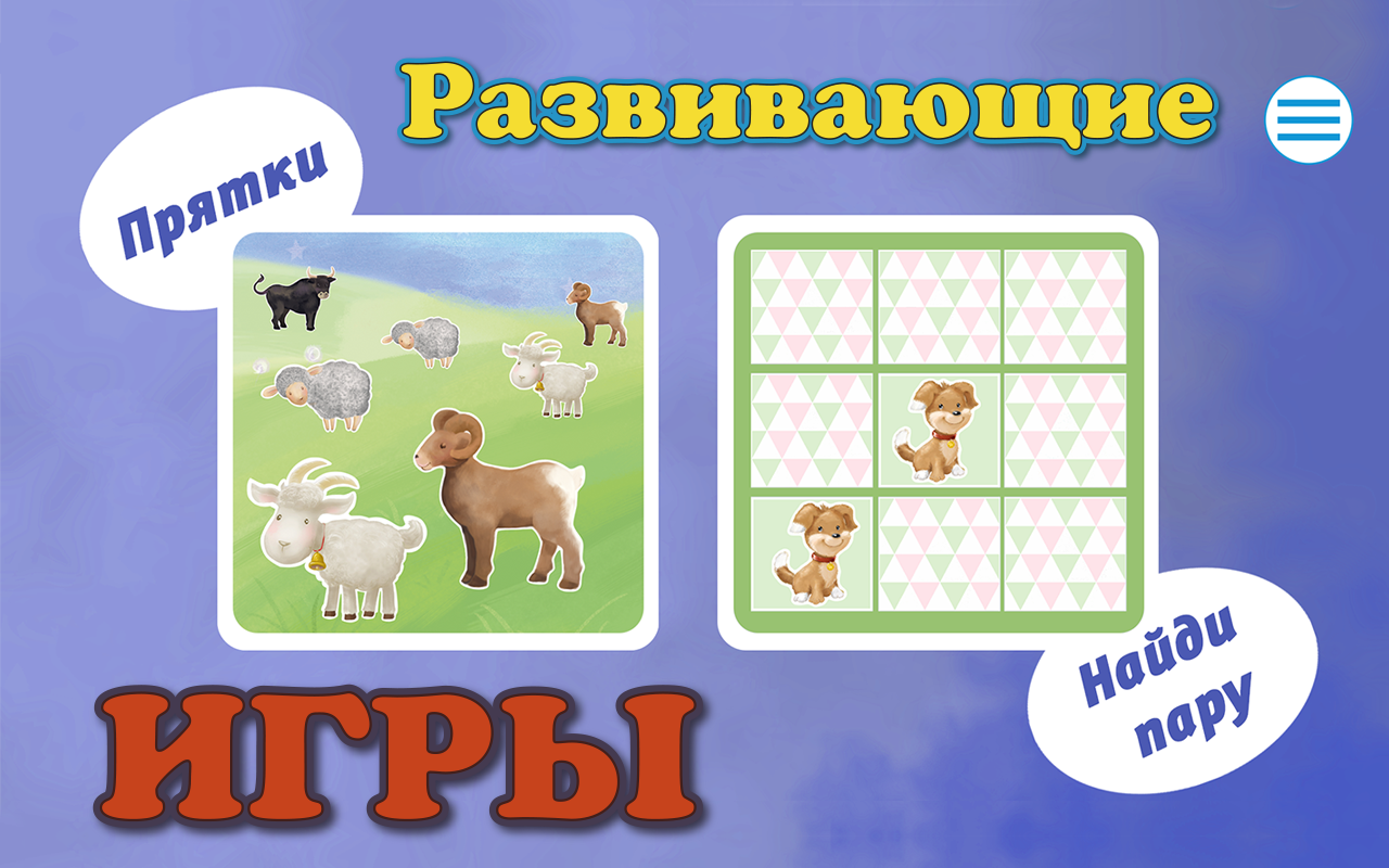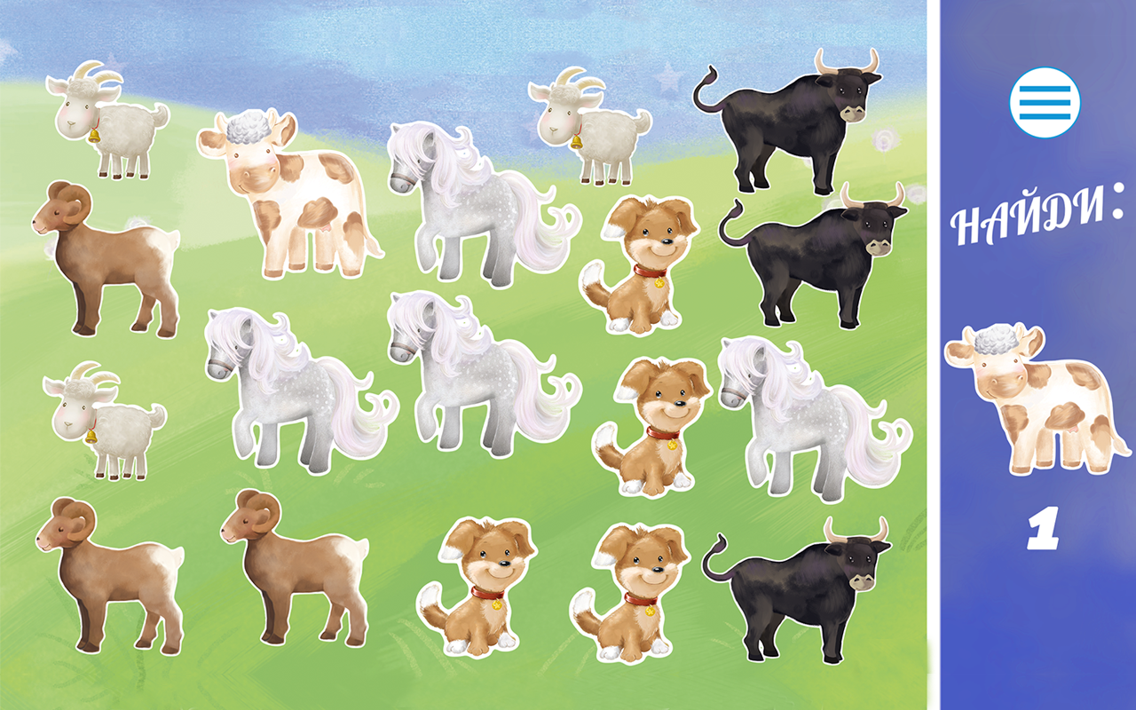 Так же для малышей будут приятным сюрпризом - интересные и в тоже время развивающие игры " Найди пару " и " Прятки ". Игры, направлены на запоминание животных, а так же на развитие внимания. Во время игры для ребенка будет работать маленькая ферма, так же малыш окажется на лугу и узнает, каких животных можно держать дома.
