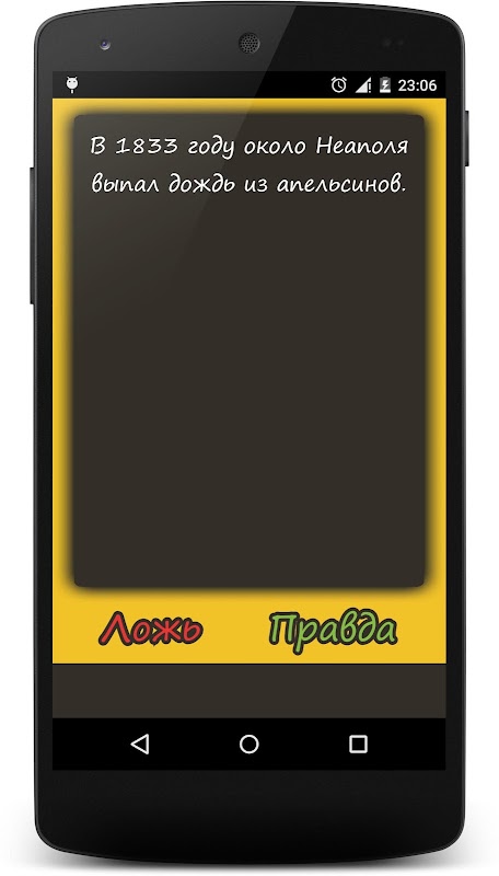 Правда или Ложь – интеллектуальная игра, известная очень многим с детства. Вам предлагаются утверждения из различных областей с которым Вы можете согласиться или же не согласиться.