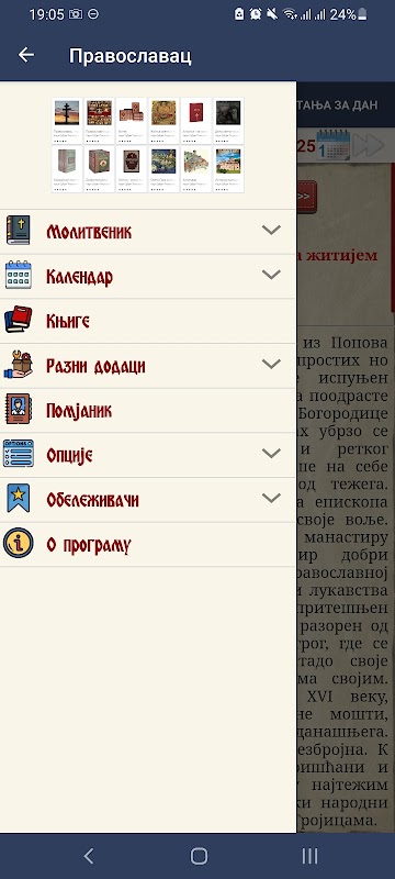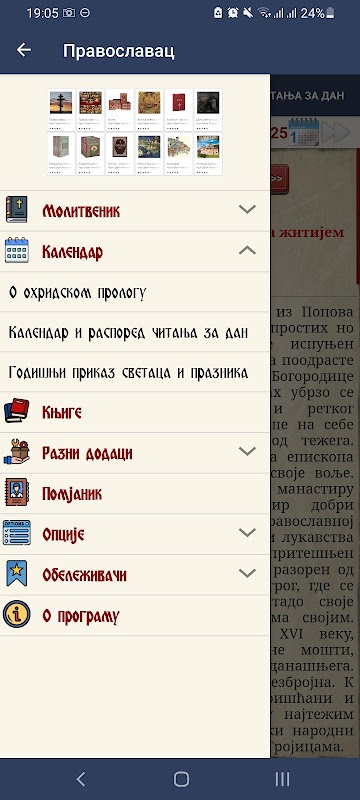 - El programa también contiene el calendario de la iglesia ortodoxa con las fechas de ayuno a lo largo del año y la vida de los santos - el prólogo de Ohrid para cada día del año. Las vidas y obras de los santos de la Iglesia Ortodoxa se describen en las vidas de los santos.