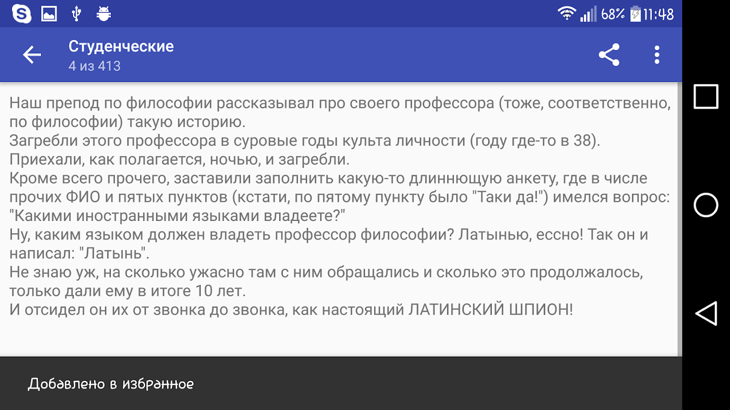 В нашем приложении вы найдете много историй как длинных, так и коротеньких, которыми вы можете поделится в нужное время с знакомыми и близкими. Кто знает, может одна из наших историй поможет заключить контракт на миллион долларов или сразить наповал девушку вашей мечты…