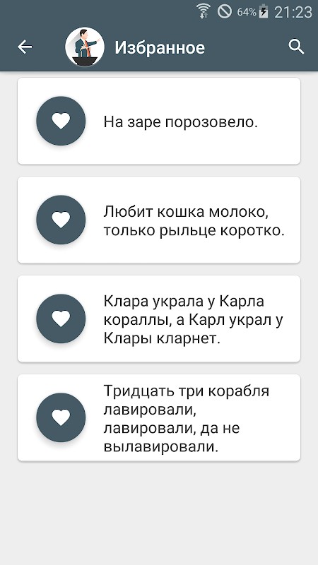 En la aplicación "El desarrollo del habla. Skorogovory", se recogieron 500 patrones populares, divididos en categorías, donde puede elegir ciertas letras que desea aprender a pronunciar correctamente.