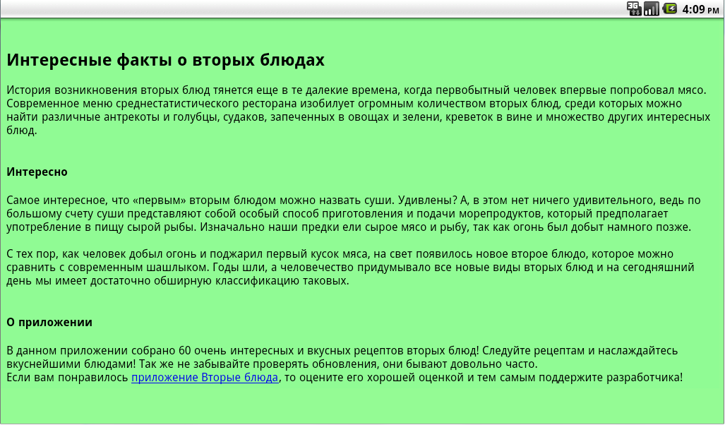В данном приложение вы найдёте 60 различных рецептов вторых блюд из мяса, рыбы, овощей и грибов! Так же вы найдёте некоторые быстрые решения для стола. Качайте и готовьте с удовольствием!