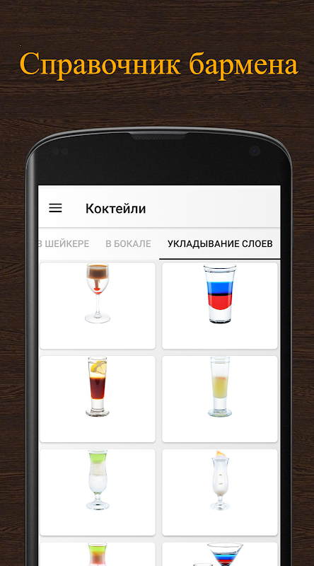 Todos los cócteles se colocan en los grupos apropiados de acuerdo con el método de preparación. Los ingredientes se colocan en las secciones apropiadas y facilitan la búsqueda y selección de cócteles. Simplemente seleccione el elemento de interés y lea la historia de la bebida.