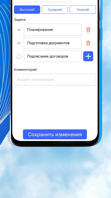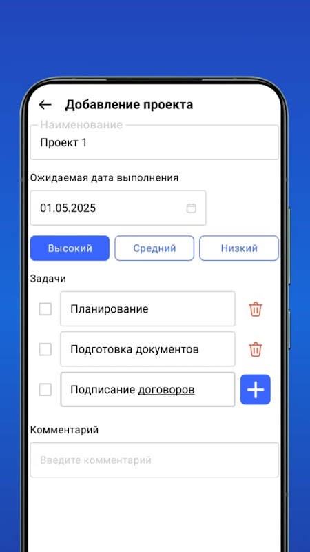 La aplicación está diseñada para realizar un seguimiento de proyectos con la capacidad de establecer prioridades (alta, media, baja), establecer una fecha de finalización y compilar una lista de tareas para cada proyecto.