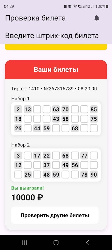 También hay un botón "Verificar ticket", después de hacer clic en el cual el usuario recibe instantáneamente los resultados. Si ganas, la aplicación no sólo te lo notifica, sino que también te muestra la cantidad ganada para un sorteo específico. No pierdas la oportunidad de conocer grandes victorias, como le pasó a un residente de Voronezh que ganó la lotería rusa.