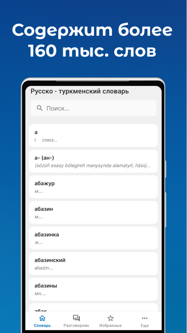 Hay una función de búsqueda para encontrar rápidamente la palabra que necesita en dos idiomas a la vez. No es necesario elegir ruso - turcomano o turcomano - ruso. Introduzca palabras en la búsqueda tanto en ruso como en turcomano.