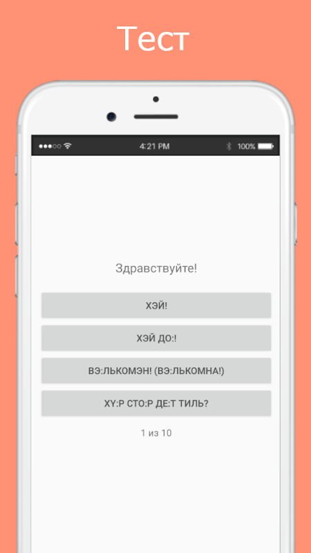 После прохождения теста по выбранной теме, можно просматривать ошибки. Также, результат прохождения теста по каждой из тем сохраняется, ваша цель - выучить все слова в выбранной теме на 100%.