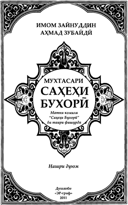 Ba Tam ittifoқi Ummati Islom saҳeҳtarinu mӯtamadtarin Kitob Badi Қuroni Karim "Saҳeҳ 's Imomi muҳaddisin Abӯabdulloҳ Muҳammad Ismoil Ibn Ibn Ibroҳim Muғira Ibn Ibn Bardizbeҳi Buhorӣ meboshad.