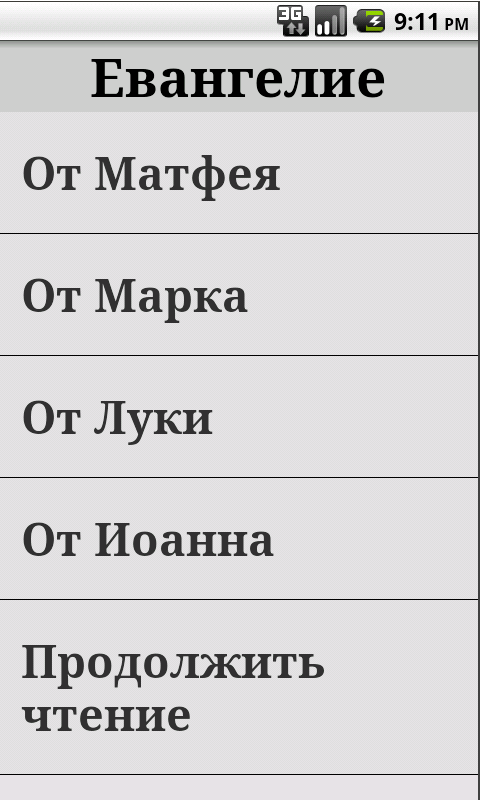 Todos los ajustes de este programa se realizan a través del menú. Si el teléfono o la tableta no se muestra el botón de menú, usted puede llamar a otra. Para páginas con listas tienes que pulsar en el título de la lista de las páginas con el texto del Evangelio que hacer clic en la esquina superior izquierda de la pantalla.
