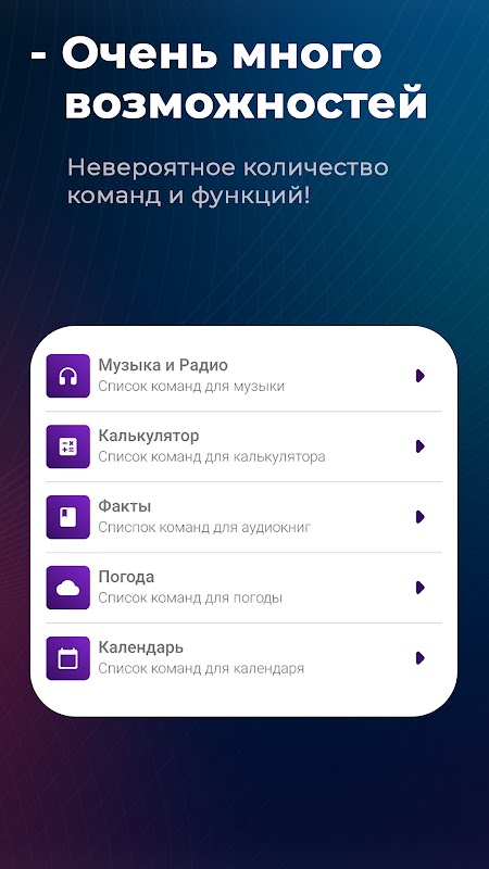 Además de comandos útiles, el asistente de voz de Siri tiene muchos comandos para la educación y el desarrollo general. Nuestra aplicación tiene varias secciones: Hechos, Traductor, Calculadora y Comandos Secretos. La lista completa de comandos se encuentra en nuestra aplicación Comandos para Siri. Después de la instalación, seleccione la sección deseada y diga el comando al asistente.