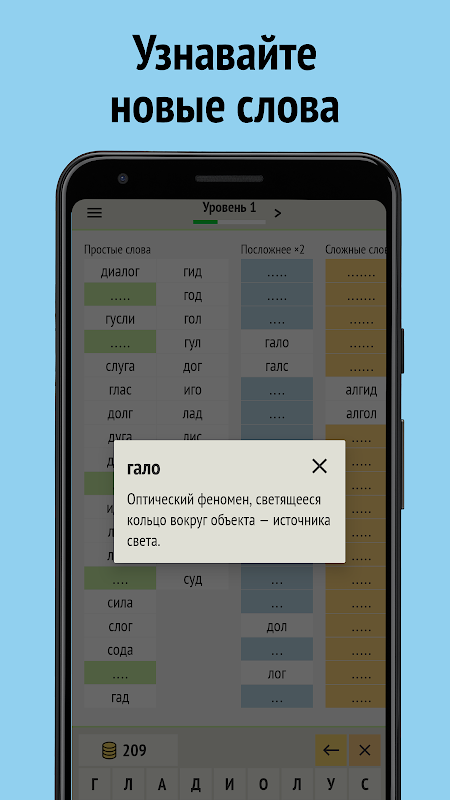 Las monedas se pueden usar para obtener una pista (abrir una letra en una palabra, descubrir el significado de una palabra o abrir la palabra completa), para hacer esto, haga clic en cualquier palabra sin abrir.