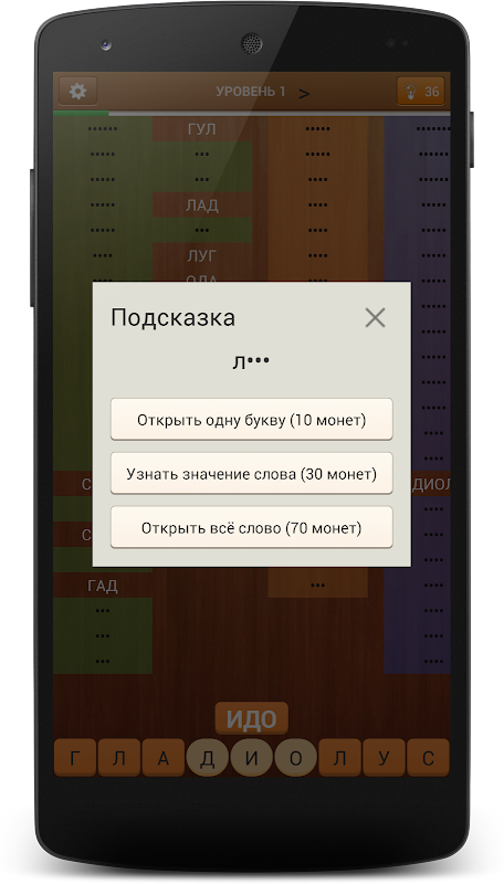 Монеты можно использовать, чтобы получить подсказку (открыть букву в слове, узнать значение слова или открыть все слово), для этого нажмите на любое не открытое слово.