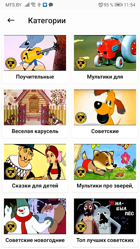 * выбор мульфильма по категориям (мультики про животных, поучительные мультики, приключения и другие)