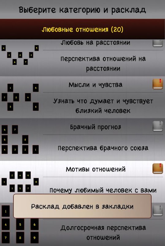 ✔ la capacidad de agregar tarjetas y diseños a favoritos, así como ver y guardar el significado de las tarjetas directamente en el diseño (disponible solo en la versión completa).