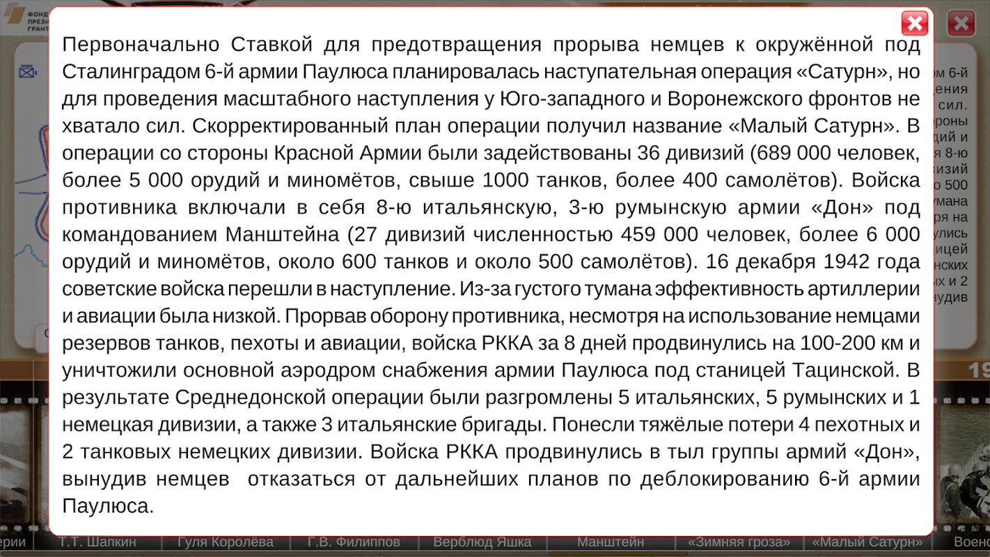 La aplicación está disponible en ruso. Lanzamiento de la aplicación gratuita "Stalingrado. Path to Victory ”está dedicado al 75 aniversario de la Victoria en la Gran Guerra Patria y puede usarse para clases patrióticas interactivas adicionales en las escuelas. La aplicación proporciona 3 modos: "ENCICLOPEDIA" (para familiarizarse con la historia de la Batalla de Stalingrado), "VICTORINA" (para verificar la asimilación de los conocimientos adquiridos) y "LUCHA INTERACTIVA" (para realizar una competencia intelectual para varios equipos de participantes). Si en el proceso de verificar el conocimiento le resulta difícil responder, presione el botón "SALTAR". El icono de pregunta abre una ventana de ayuda. Después de pasar la prueba, el resultado se muestra en la pantalla (tiempo total empleado, número de errores y omisiones).