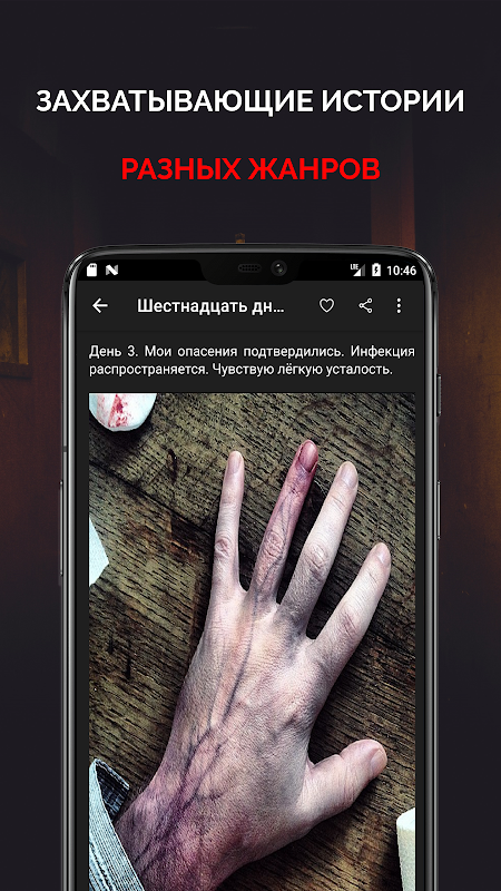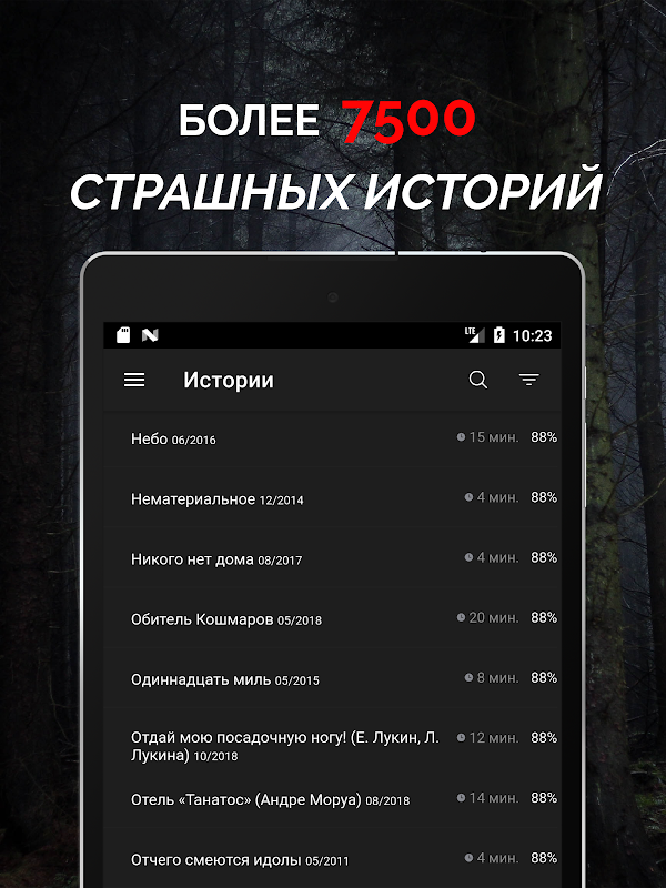 Para comodidad del usuario, las historias de miedo se dividen en diferentes categorías con la indicación de la calificación del usuario. Para no perderse en una gran cantidad de textos, la aplicación admite la búsqueda, clasificación y la función de agregar una historia de terror favorita a favoritos.