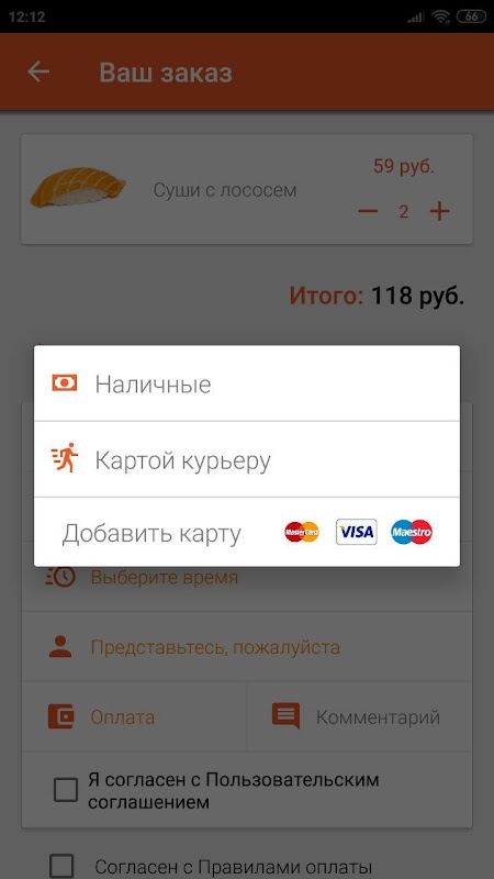 Выберите способ оплаты: Наличными или картой. Примите правила оплаты и нажмите кнопку “Заказать”.