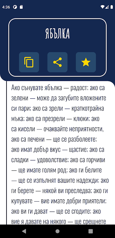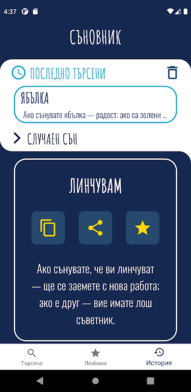 Имате възможност да създавате записи, като добавяте сънища в "Любими" или проверявате предишните търсения в "История".