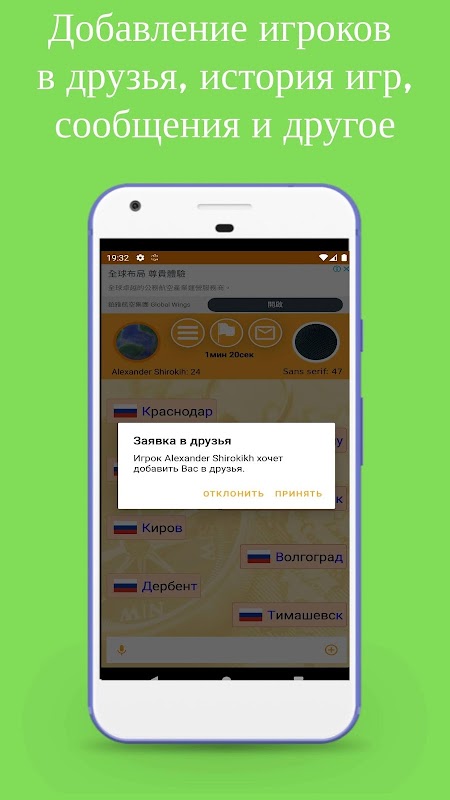 ¡El juego Ciudades conocido por todos desde la infancia! ¡Compite en inteligencia con tu teléfono! ¡Más de 20 000 ciudades de todo el mundo están disponibles en la base de datos del juego! Puedes elegir 4 niveles de dificultad del juego. El juego también ofrece un modo de 2 jugadores, multijugador a través de una red Wi-Fi local o un modo en línea a través de Internet. Si una ciudad no puede venir a su mente con la letra que necesita, entonces siempre puede usar la pista.