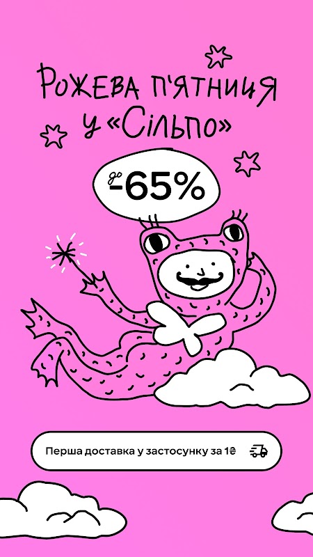 Recibe tu compra de supermercado, artículos para niños y platos preparados de los supermercados Silpo. ¡También pizza, hamburguesas y flores! Todo online: pide la entrega para el día y la hora que prefieras. Si tienes prisa, ¡entrega exprés en tan solo 59 minutos! Pide comida y productos de supermercado en pocos clics. Paga con tarjeta al recibir tu pedido o a través de la app.