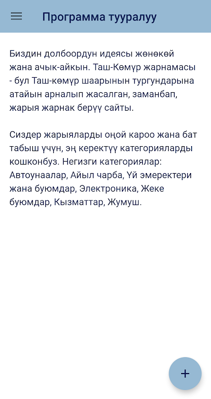 La idea de nuestro proyecto es simple y clara. Tash-Kumyr, Shamalduu-Sai Advertising es una aplicación de publicidad moderna especialmente diseñada para residentes de los pueblos de Tash-Kumyr, Shamaldy-Sai, Kyzyl-Jar, Tendik, Dostuk, Yntymak, Kyzyl-Jar-12.