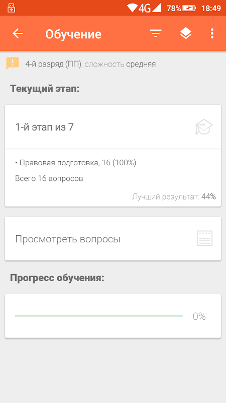 - режим "Обучение", который позволяет поэтапно изучить все вопросы выбранного разряда