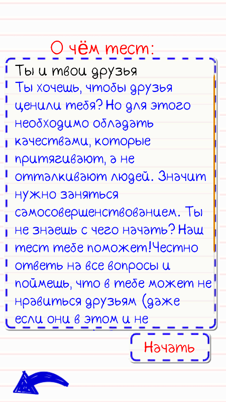 ¡Encuentra respuestas a tus preguntas y conviértete en el centro de atención de todos tus amigos y amigos! ¿Quieres saber lo que realmente eres? ¿Cómo te ves a los ojos de amigos, padres, conocidos? ¿Quieres evaluar tus capacidades y alcanzar tu potencial? ¿Conoces tus fortalezas y debilidades? Es mejor conocerte a ti mismo y a tus seres queridos. ¡Entonces esta es una aplicación de pruebas originales y emocionantes para ti!